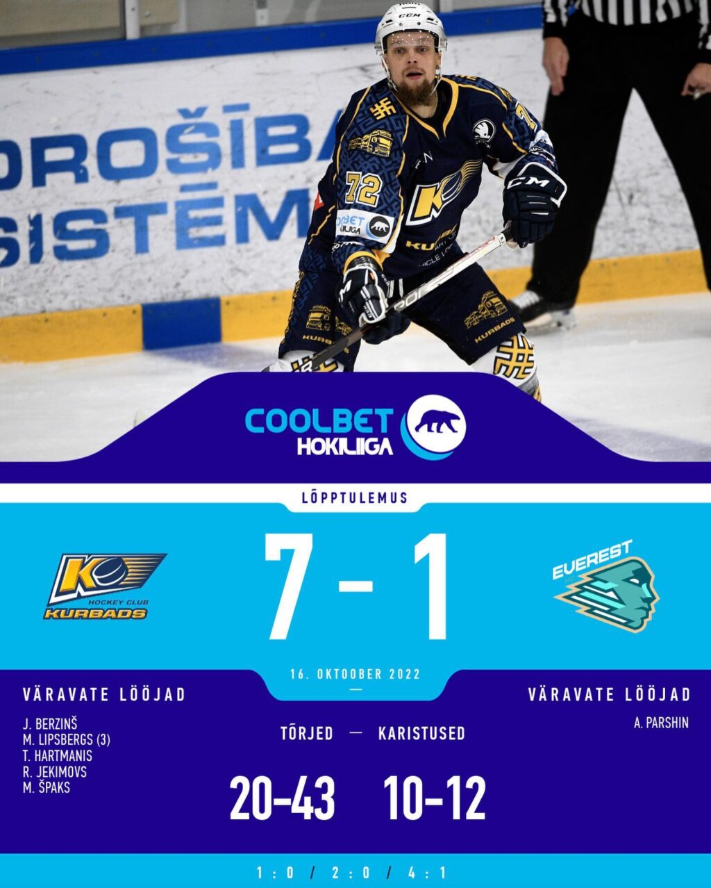 HK Kurbads alistas koduhallis Kohtla-Järve HC Everesti 7:1 (1:0, 2:0, 4:1). Võitjate poolel hiilgas kübaratrikiga Miks Lipsbergs, ühe värava visakasid Juris Berzinš, Toms Hartmanis, Roberts Jekimovs ja Martinš Špaks. Marcis Zembergs ja Martins Vitolinš said kirja kaks resultatiivset söötu. HC Everesti auvärava viskas viimasel mänguminutil Andrei Parshin. Väljakuperemeeste väravavaht Arginto Milbergs tõrjus mängu jooksul 20 ning HC Everesti kollkipper Dmitri Rovda 43 vastaste pealeviset.