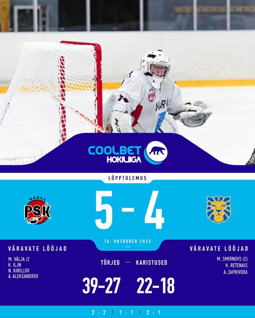 Narva PSK alistas kodujääl HS Riga 5:4 (2:2, 1:1, 2:1). Narva PSK kasuks viskas kaks väravat Max Välja ning ühe Kirill Iljin (1+1), Nikita Kirillov (1+2) ja Andrei Aleksandrov. HS Riga poolel olid täpsed Marcis Smirnovs (2+0), Krists Retenais (1+1) ja Aleksei Zaprivoda (1+1). Piirilinna meeskonna võitu andis olulise panuse 39 vastaste pealeviset tõrjunud väravavaht Daniil Seppenen. HS Riga poolel tegi Oskars Gusev 27 tõrjet.
