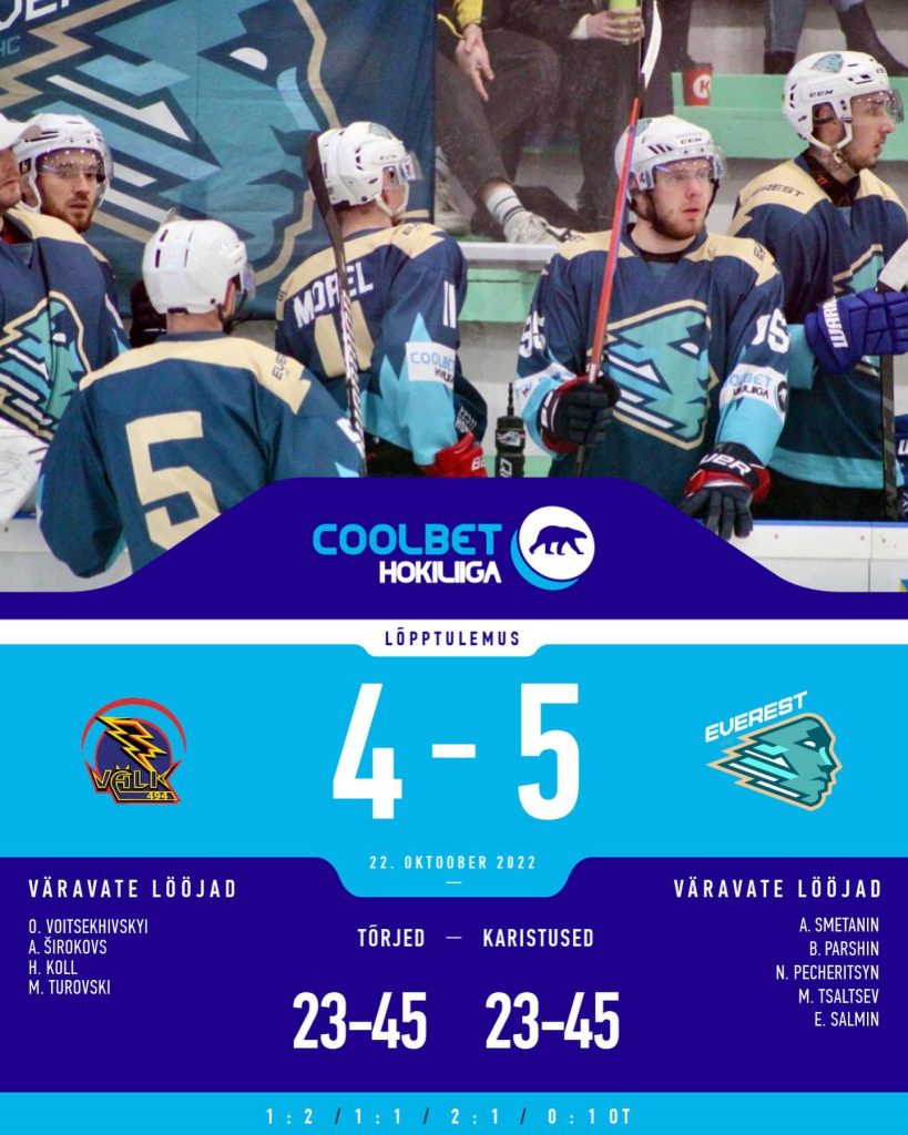 Tiitlikaitsja Tartu Välk 494 kaotas oma kodujääl Astri Arenal Kohtla-Järve HC Everestile tulemusega 4:5 (1:2, 1:1, 2:1, 0:1). Tartlaste poolel tegid skoori Oleksii Voitsekhivskyi, Aleksejs Širokovs (1+1), Harri Koll ja Maksim Turovski. Võitjate väravad viskasid Aleksandr Smetanin (1+2), Andrei Parshin, Nikita Pecheritsyn (1+1), Maksim Tsaltsev (1+1) ja lisaajal võidutabamuse sepistanud Erik Salmin. Välgu väravavaht Antons Naumovs tõrjus mängu jooksul 20 ning HC Everesti kollkipper Dmitri Rovda 42 vastaste pealeviset.