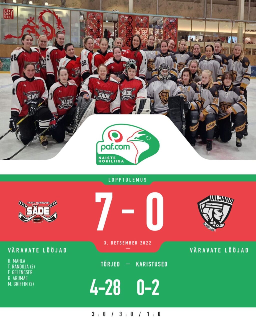 PAF Naiste Hokiliigas sai Tartu HK Säde kodujääl Astri Arenal suure 7:0 (3:0, 3:0, 1:0) Viljandi Hokiklubi üle.