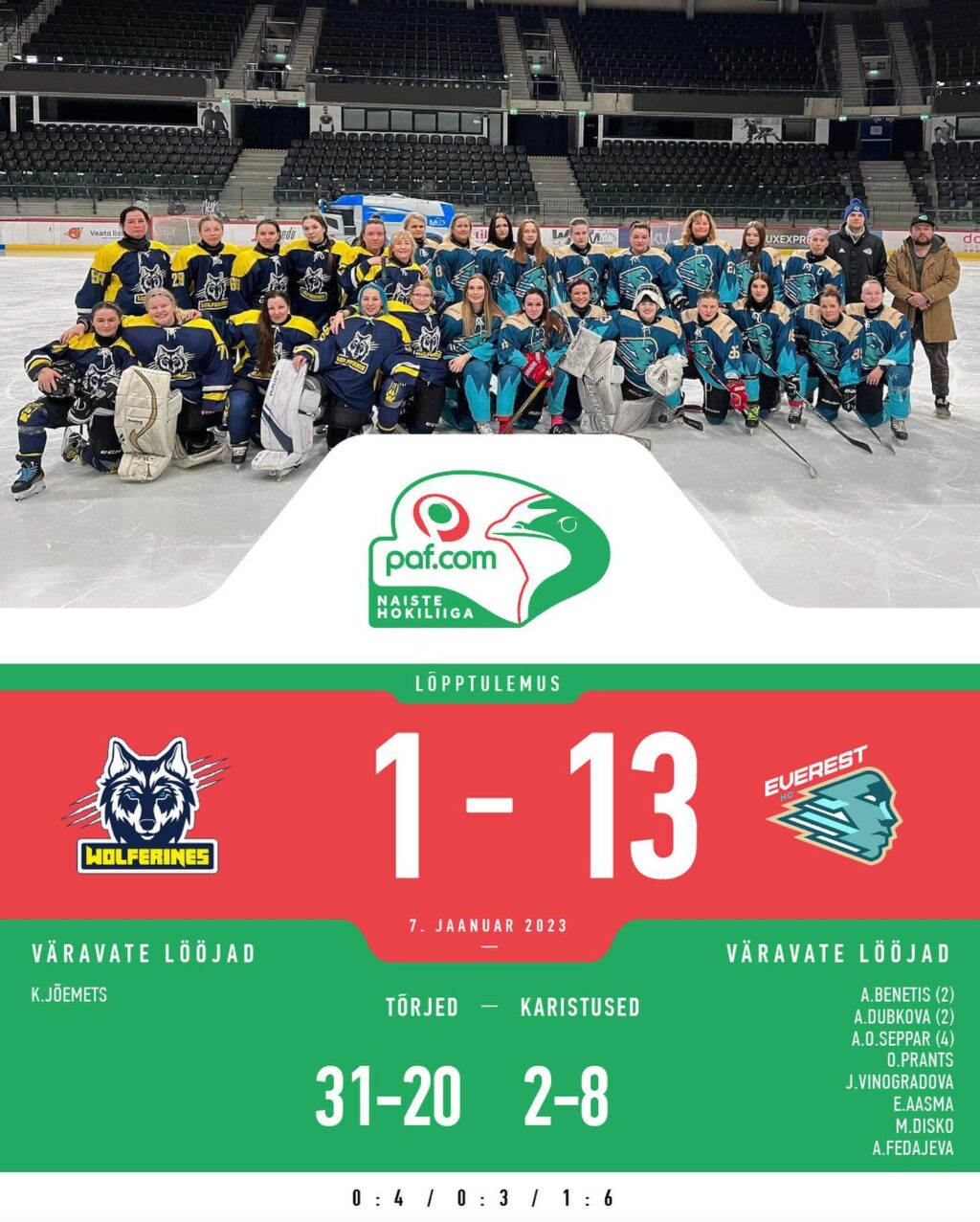 Kohtla-Järve HC Everest sai Tondiraba jäähallis suure 13:1 (2:0, 5:0, 6:1) võidu Tallinna HC Wolferinesi üle. Ida-Virumaa naiskonna poolel tegid skoori Arina Benetis (2+0), Anna Dubkova (2+0), Aleksandra-Olga Seppar (3+1), Alina Semenyak (2+2), Jana Vinogradova, Estrit Aasma (1+2), Maria Disko ja Anna Fedjajeva (1+2). HC Wolferinesi auvärava viskas Kairiin Jõemets. HC Wolferinesi väravat kaitsnud Elizabete Vasiljeva Dilba (14) ja Karola Vares (17) tõrjusid kokku 31 ning Uljana Jeggi külaliste poolel 20 vastaste pealeviset.