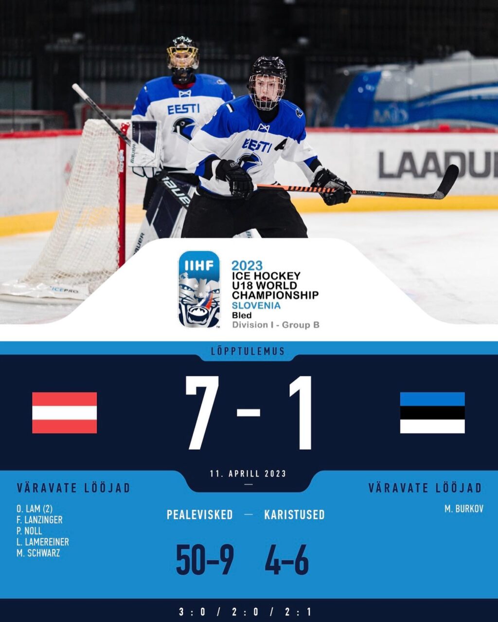 Eesti auvärava viskas kolmandal kolmandikul Maksim Burkov, tehes seisuks 6:1. Tabamusele tegi eeltöö Marcos Timmusk. Austerlaste poolel skooris kahel korral Oliver Lam ning korra Florian Lanzinger, Paul Noll, Leon Lamereiner, Johannes Neumann ja Maximilian Schwarz.